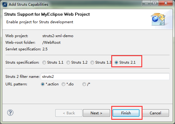 在这个项目上添加 struts2 的支持,右键点击 struts2-xml-demo 工程,选择 myeclipse -> add struts capabilities,在弹出的对话框中选择 strut 2.1,如下图所示: