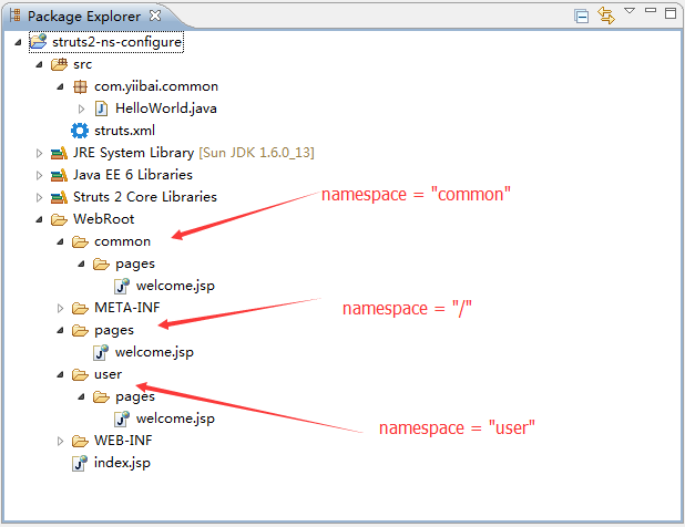<package name="common" namespace="/common" extends="struts-default"> <action name="saywelcome"> <result>/common/pages/welcome.jsp</result> </action> </package>