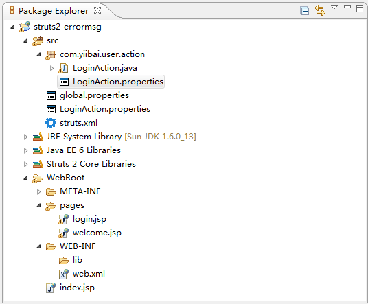在myeclipse中创建一个web工程,名称为:struts2-errormsg,看这个项目结构,如下图: