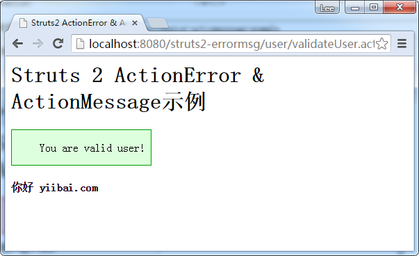 用户名是有效的,显示欢迎信息:<s:actionmessage/>