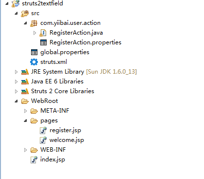 为了比较直观的学习,这里创建一个web工程为:struts2textfield。整个工程的目录结构如下: