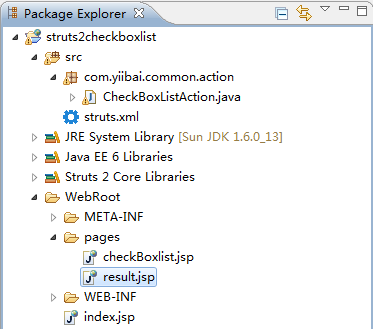 这里创建一个web工程:struts2checkboxlist,来演示在多个复选框如何设置的默认值,整个项目的结构如下图所示: