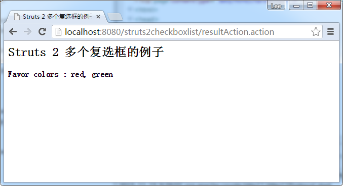 <%@ taglib prefix="s" uri="/struts-tags" %> <html> <body> <h1>struts 2 multiple check boxes example</h1> <h2> favor colors : <s:property value="yourcolor"/> </h2> </body> </html>