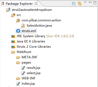 这里创建一个web工程:strut2autoselectdropdown,来演示在多个复选框如何设置的默认值,整个项目的结构如下图所示: