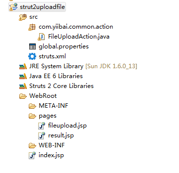 这里创建一个web工程:strut2uploadfile,来演示在多个复选框如何设置的默认值,整个项目的结构如下图所示: