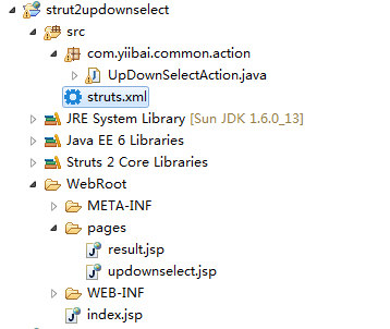 这里创建一个web工程:strut2updownselect,来演示在多个复选框如何设置的默认值,整个项目的结构如下图所示: