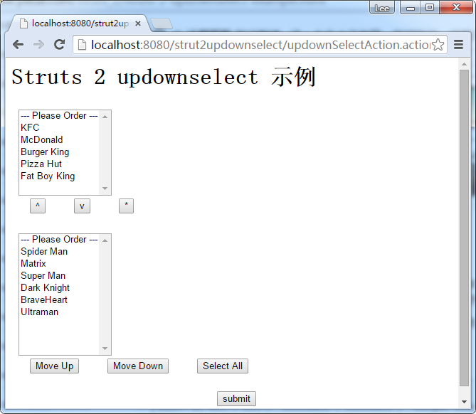 在struts2,<s:updownselect>标签用于创建一个带有按钮的html选择组件向上或向下移动在选择组件的选项。当提交表单时,所有的选择方案将提交在它们的排列顺序。