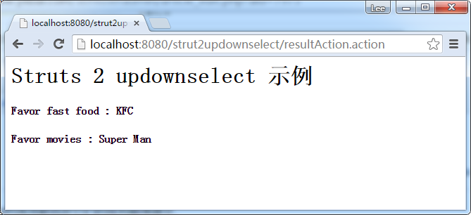 <%@ taglib prefix="s" uri="/struts-tags" %> <html> <body> <h1>struts 2 updownselect example</h1> <h2> favor fast food : <s:property value="favfastfood"/> </h2> <h2> favor movies : <s:property value="favmovie"/> </h2> </body> </html>