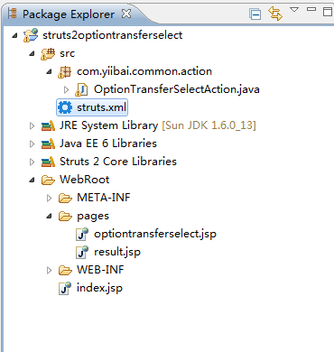 这里创建一个web工程:strut2updownselect,来演示在多个复选框如何设置的默认值,整个项目的结构如下图所示: