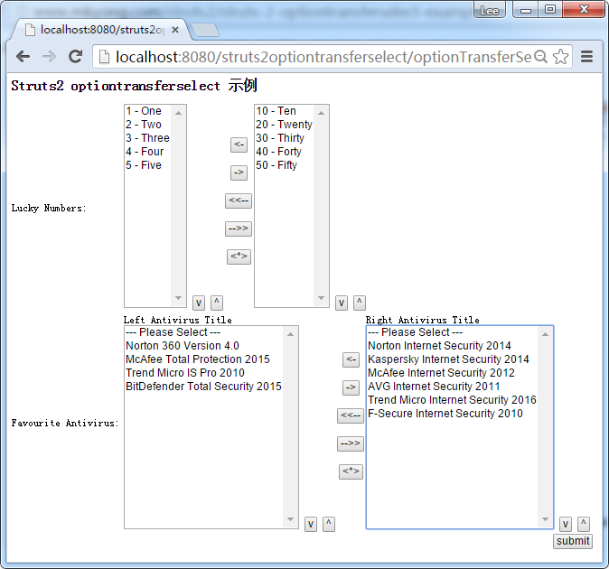 一个完整的全面的 <s:optiontransferselect> 标签例子,表明使用ognl和java列出来填充数据到“选项中选择转移”的组件。