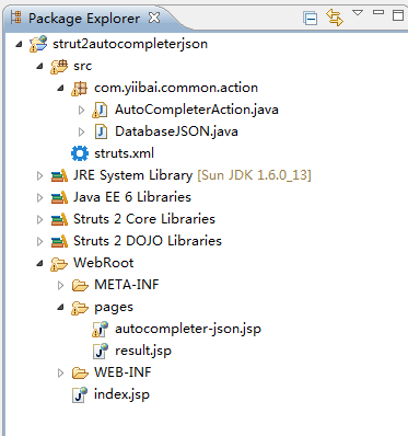 这里创建一个web工程:strut2autocompleterjson,来演示在多个复选框如何设置的默认值,整个项目的结构如下图所示: