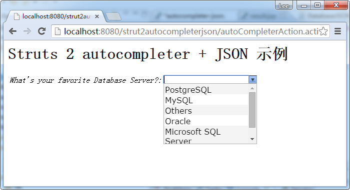 http://localhost:8080/strut2autocompleterjson/databasejson.action
