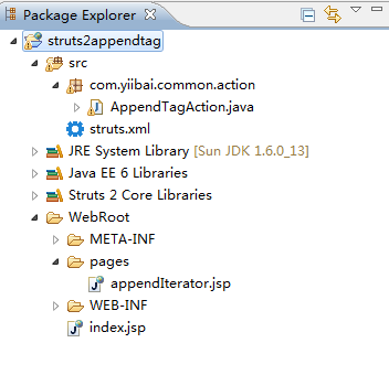 struts2 的 append(追加)标签被用来组合几个迭代器(以列表或映射创建)成一个单一的迭代器。这里创建一个web工程:struts2appendtag,来演示在多个复选框如何设置的默认值,整个项目的结构如下图所示: