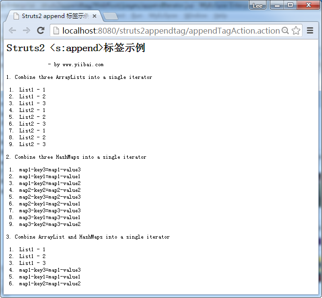 struts 2 append tag example 1. combine 3 arraylist into a single iterator. 1. list1 - 1 2. list1 - 2 3. list1 - 3 4. list2 - 1 5. list2 - 2 6. list2 - 3 7. list3 - 1 8. list3 - 2 9. list3 - 3 2. combine 3 hashmap into a single iterator. 1. map1-key3=map1-value3 2. map1-key1=map1-value1 3. map1-key2=map1-value2 4. map2-key2=map2-value2 5. map2-key3=map2-value3 6. map2-key1=map2-value1 7. map3-key3=map3-value3 8. map3-key1=map3-value1 9. map3-key2=map3-value2 3. combine arraylist and hashmap into a single iterator. 1. list1 - 1 2. list1 - 2 3. list1 - 3 4. map1-key3=map1-value3 5. map1-key1=map1-value1 6. map1-key2=map1-value2