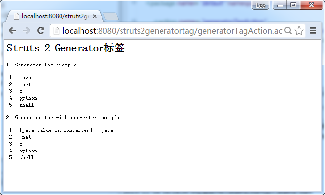 下面的jsp页面使用generator标签演示动态创建一个迭代器。“separator”属性是必需的,其分离val到迭代器的条目中。
