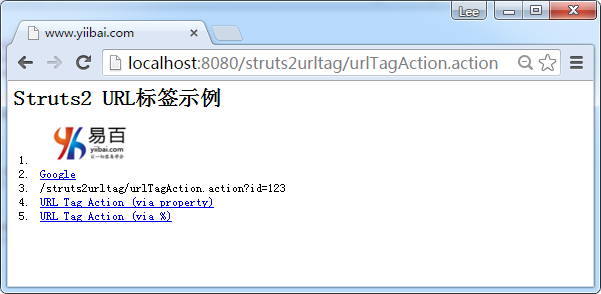 <a href="/struts2example/urltagaction.action?age=99">url tag action (via %)</a>