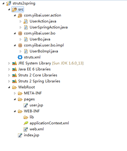 //struts.xml <action name="userspringaction" class="userspringaction" > <result name="success">pages/user.jsp</result> </action> //applicationcontext.xml <bean id="userspringaction" class="com.h3.user.action.userspringaction"> <property name="userbo" ref="userbo" /> </bean>