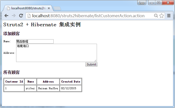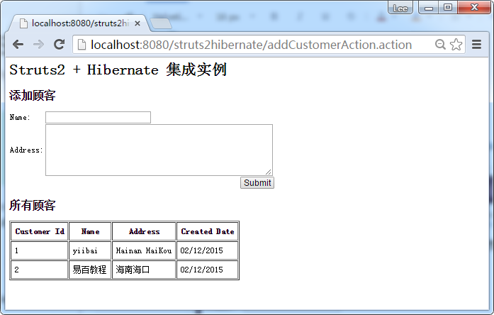 在本教程中,在struts中2开发我们显示了一个简单的客户模块(添加和列表功能),并使用 hibernate 进行数据库操作。使用上述部分机制集成(存储和检索在servlet上下文hibernate的session)。
