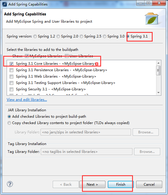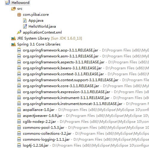 打开 myeclipse 创建一个java工程:helloword,并添加spring支持类库,右键工程名称,选择"myeclipse"->"add spring capabilites",如下图: