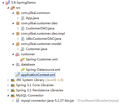 <beans xmlns="http://www.springframework.org/schema/beans" xmlns:xsi="http://www.w3.org/2001/xmlschema-instance" xsi:schemalocation="http://www.springframework.org/schema/beans http://www.springframework.org/schema/beans/spring-beans-2.5.xsd"> <bean id="customerdao" class="com.h3.customer.dao.impl.jdbccustomerdao"> <property name="datasource" ref="datasource" /> </bean> </beans>