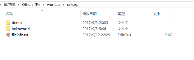 可以在f:\worksp\csharp目录内看到有一个文件:fileinfo.txt被创建。如下图中所示 -