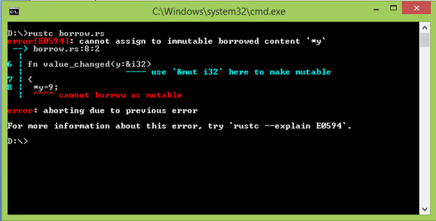 在上面的示例中,它会引发错误,因为&x是不可变引用。 因此,无法改变y的值。