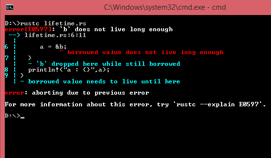 在上面的示例中,外部作用域包含a变量,并且它不包含任何值。 内部范围包含变量b,它存储的值为10。b变量的引用存储在变量a中。 当内部范围结束时,尝试访问a的值。 rust编译器将抛出一个编译错误,因为a变量指的是变量的位置超出了范围。 rust将使用借用检查器确定代码无效。