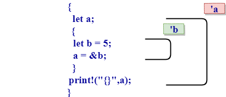 在上面的例子中,a变量的生命周期短于b变量的生命周期。 因此,上面的代码运行时没有任何编译错误。
