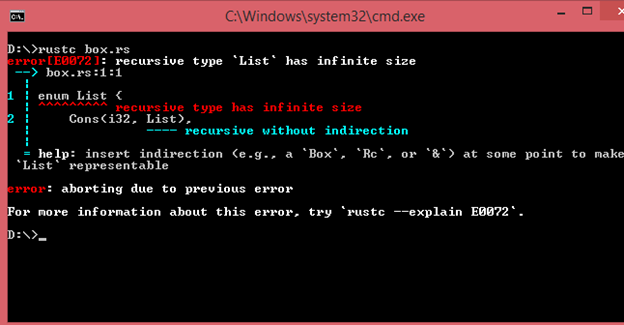 在上面的示例中,rust编译器抛出错误“具有无限大小”,因为list类型包含递归的变体。 因此,rust无法找出存储list值所需的空间。 使用box <t>可以克服无限大小的问题。