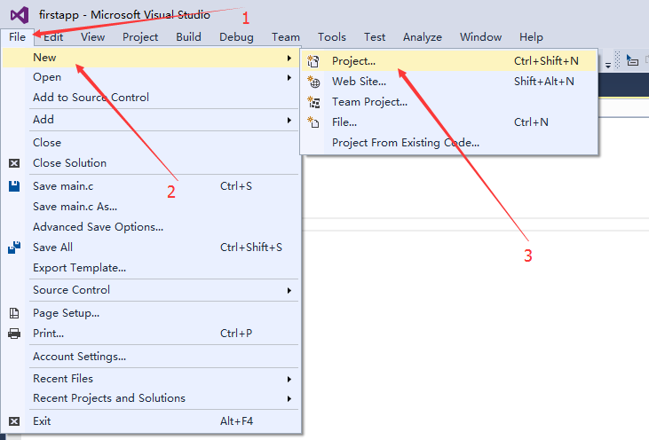 步骤1 - 打开visual studio 2017创建一个名称为 helloworld 的项目,通过菜单:file -> new -> project…, 如下 -