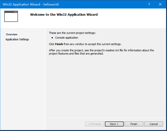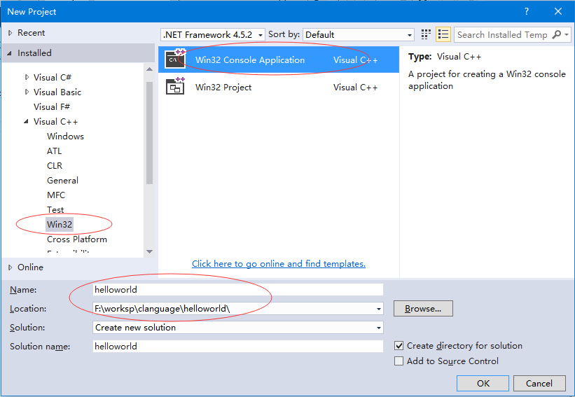 步骤2 - 在打开的新界面中,左侧菜单中选择 win32 -> win32 console application,然后填入项目名称为:helloworld,项目文件位置是:f:\worksp\clanguage\helloworld\,如下所示 -