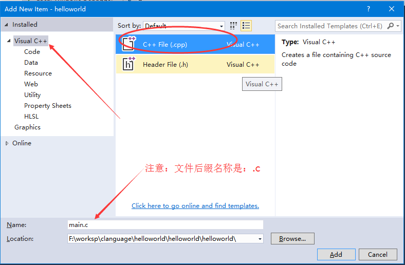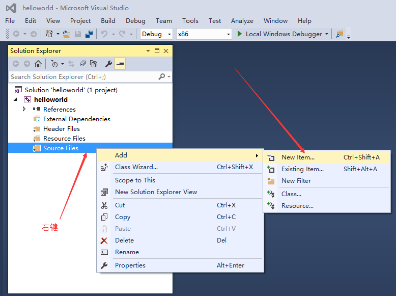 步骤5 - 打开solution explorer(找不到可通过主菜单view下拉选择),在项目helloworld下,右键点击子项source files->add -> new item…,创建一个源文件和代码:main.c,如下所示 -