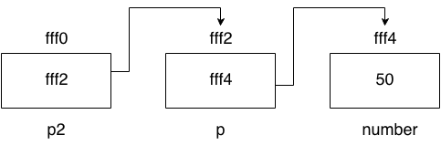 如上图所示,p2包含p的地址(fff2),p包含数字变量的地址(fff4)。