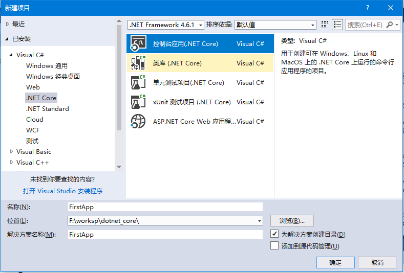 在“新建项目” 对话框的“模板”列表中,展开“visual c# ” 节点并选择“.net core”,然后应该看到以下三个新项目模板。