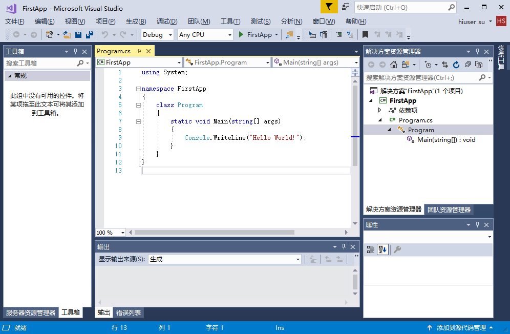 visual studio将打开新创建的项目,在“解决方案资源管理器”窗口中看到此项目中的所有文件(自动生成)。