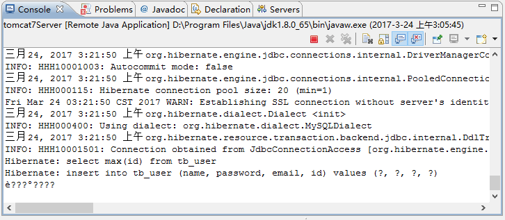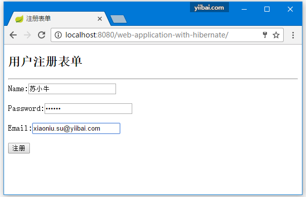 发布上面的工程到 tomcat sever中,打开浏览器访问url:http://localhost:8080/web-application-with-hibernate/ , 没有错误应该会看到下面界面并写入相关内容 -