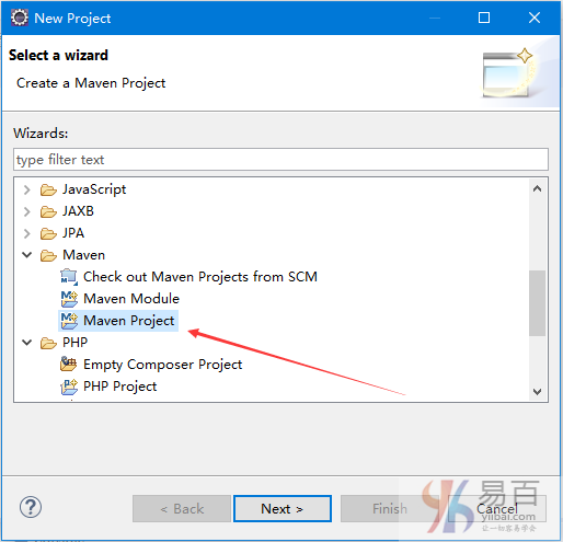 在这里,创建一个maven项目并在pom.xml中声明使用的hibernate库。打开 eclipse,选择菜单 file -> new -> other…,在弹出框中选择 maven,如下所示 -