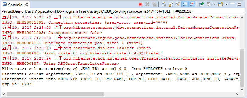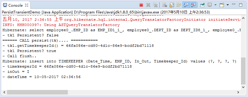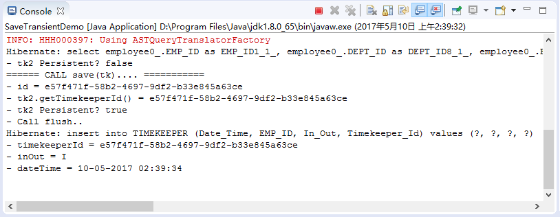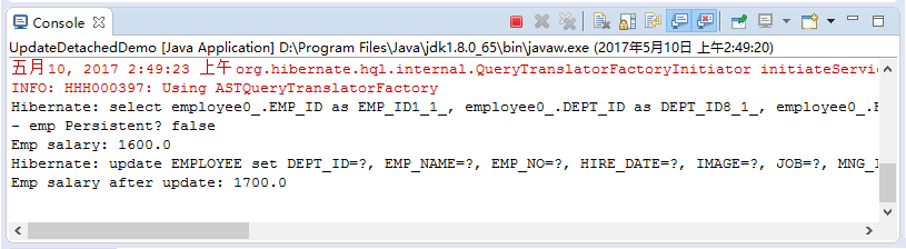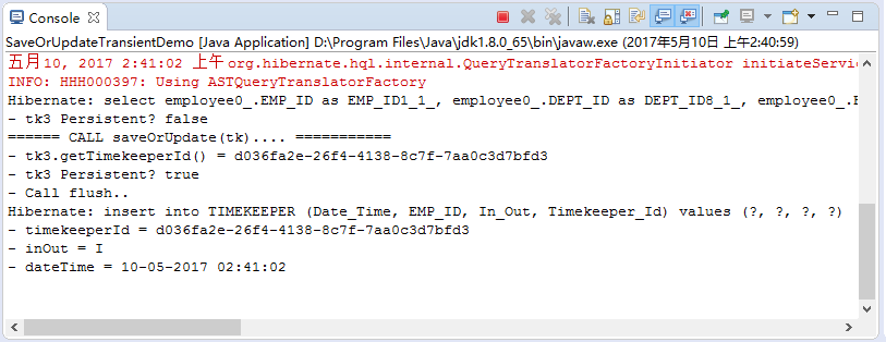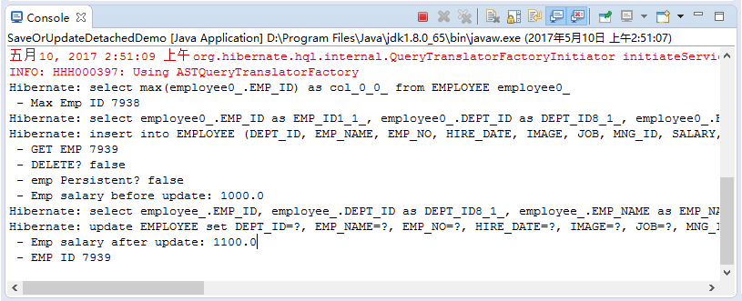执行上面代码,多几次运行示例错码,可以看到两种情况,saveorupdate()方法调用在数据上插入或更新。得到以下结果 -