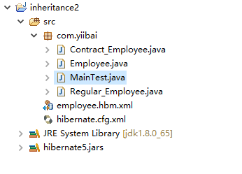 在这个例子中,我们创建了三个类,并在employee.hbm.xml文件中提供了这些类的映射。创建一个项目:inheritance2, 完整的项目结构如下 -