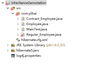 在这个例子中,我们创建了三个类,并在employee.hbm.xml文件中提供了这些类的映射。创建一个项目:inheritance2annotation, 完整的项目结构如下 -