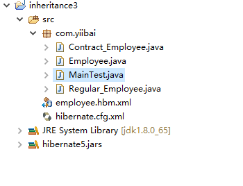在这个例子中,我们创建了三个类,并在employee.hbm.xml文件中提供了这些类的映射。创建一个项目:inheritance2annotation, 完整的项目结构如下 -