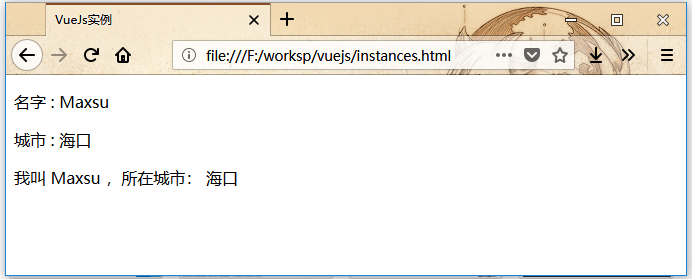 名字:{{name}}值将在插值内被替换,即{{}}与在数据对象中分配的值,即:maxsu。 城市也是如此。