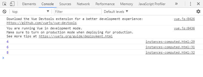 变量vm是vue的一个实例,它调用asquare和asum函数。 另外vm.asquare = 3从asquare函数调用set函数,vm.asquare调用get函数。可以查看浏览器中的输出,如下图所示。
