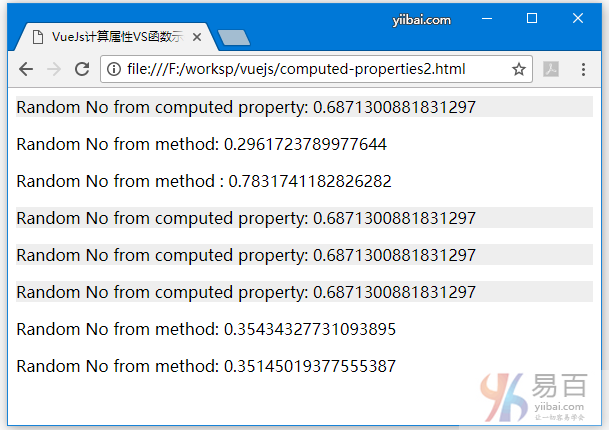 它显示在浏览器中,如下所示。 该方法和计算属性被称为多次显示差异。