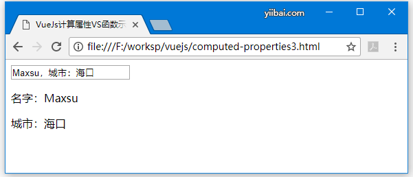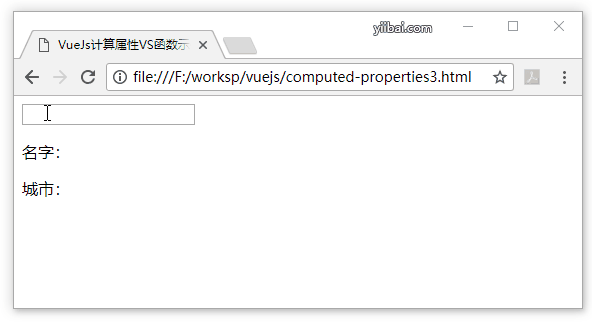 当键入文本框时,函数返回的是相同的,当属性name或city改变时。 因此,在计算属性的帮助下,不必做任何具体的事情,比如调用函数。 通过计算属性,它可以自己调用,就像名字和城市在变化中使用的属性一样。在下面的浏览器中显示相同的内容。输入文本框,并使用计算的功能更新。