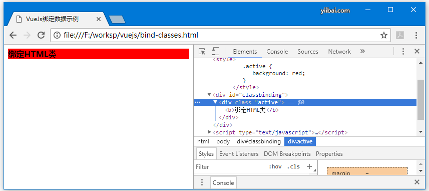 在这里,isactive是一个基于true/false的变量。它会将活动类应用于div。 在数据对象中,已经将isactive变量赋值为true。 在样式.active中定义了一个类,背景色为红色(red)。