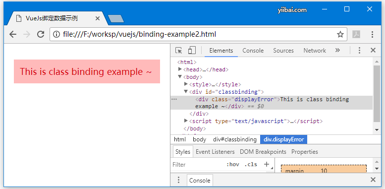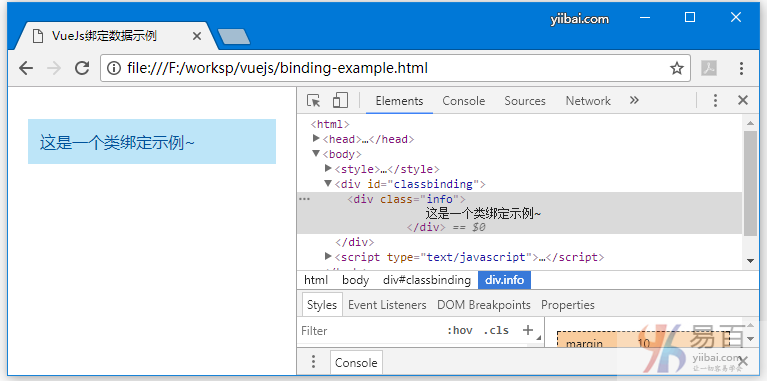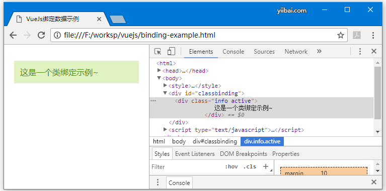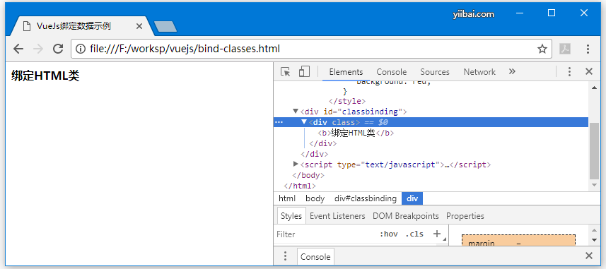 要绑定html类,需要使用v-bind:class。 下面来看看一个例子,并在其中绑定类。创建一个文件:bind-classes.html -
