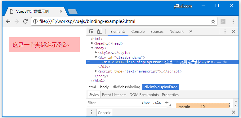 在上面的显示中,在dom中可以看到两个类被分配给div,info和active。 让haserror变量为true,isactive为c。效果如下 -