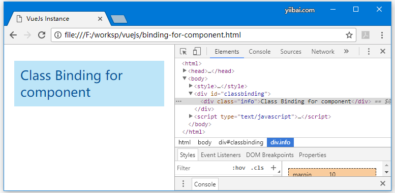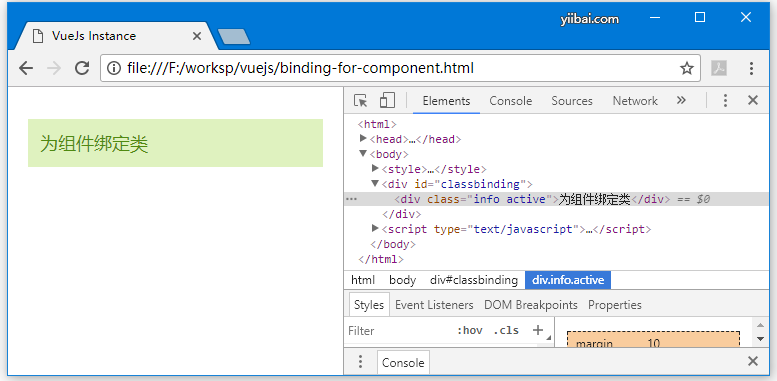 下面将为组件中的类添加v-bind。 在下面的例子中,我们已经向组件模板和组件添加了一个类。