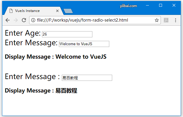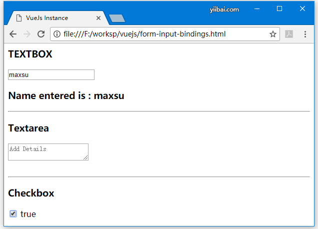 到目前为止,在前面创建的例子中,已经看到v-model绑定输入文本元素和绑定到指定变量的值。下面将了解表单输入绑定。
